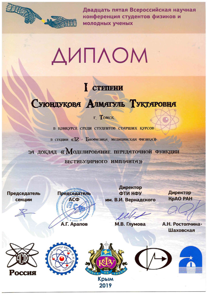 Доклады представили магистранты 1-го и 2-года обучения. Авраменко Дмитрий (тема «Измерение геометрических параметров вестибулярного аппарата крысы с использованием микроКТ) Суюндукова Алмагуль (тема «Моделирование передаточной функции вестибулярного импланта») Акинина Мария (тема «Электрическая модель вестибулярного органа») Кудайбергенова Меруерт (тема «Физико-математическое моделирование электрической Read more